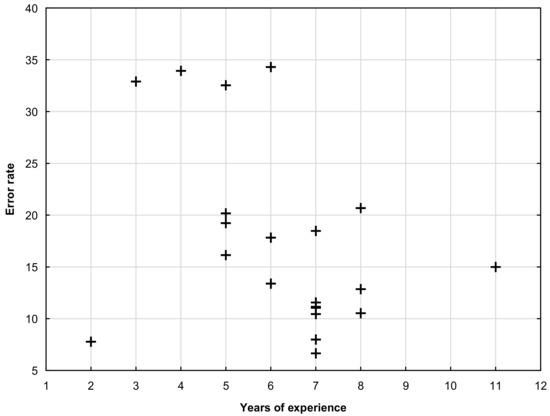 The experience in field mapping ranged from 2 to 11 years. One-third of the field workers had five or fewer years of experience, and two-thirds had more than five years of experience (Table 5). According to the Spearman rank-order correlation, there was no statistically significant negative relationship (ρ = −0.38; p= 0.09) between the years of experience and MCO error rates (Figure 5). Nonetheless, Figure 5 indicates an overall decreasing trend in error rates with increasing years of experience. There was only one field worker with two years of experience, and he had one of the lowest error rates (Figure 4b). Workers with three to four years of experience had significantly higher error rates, but the error rate decreased thereafter.
