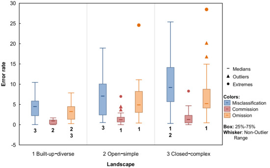 Box plots for the rates of misclassification, commission, and omission errors in the different landscapes defined in Table 4. For a given error type, based on the Kruskal–Wallis multiple comparison of mean ranks for all groups: 1 = statistically significant difference from built-up-diverse, 2 = statistically significant difference from open-simple, 3 = statistically significant difference from closed-complex.