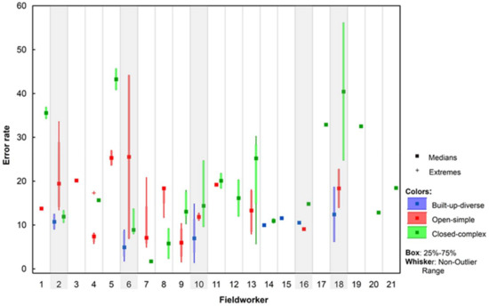 Box plots of the summed values of MCO error rates (all three categories combined) by field workers in the three landscape types defined in Table 4. Field workers who mapped all three landscape types are shaded grey.