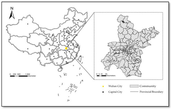 We conducted our study in the city of Wuhan, Hubei Province, China (Figure 1). Wuhan is a megacity that serves as the political, economic, and educational center of central China. Yangtze River, the third largest river in the world, divides Wuhan’s downtown into three parts, and Han River, its largest tributary, divides the three main towns (Wuchang, Hankou, and Hanyang). Wuhan has 13 municipal districts and 160 sub-districts [45]. The city has a total area of 8494.41 km2, and the downtown area is 863 km2. The permanent population is about 10.7662 million.