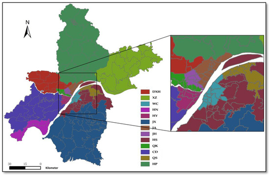 Wuhan include seven downtown districts (Jiang’an (JA), Jianghan (JH), Qiaokou (QK), Hanyang (HY), Wuchang (WC), Qingshan (QS), and Hongshan (HS)) and six suburban districts (Caidian (CD), Jiangxia (JX), Huangpi (HP), Xinzhou (XZ), Dongxihu (DXH), and Hannan (HN)) (Figure 2). Each has different characteristics; for example, most colleges and universities in Wuhan are concentrated in Wuchang, while commercial and political centers are concentrated in Jianghan and Qiaokou. Meanwhile, Caidian and Dongxihu have many scenic spots, meaning that the tourism industry is relatively developed in both districts, and industries are concentrated in Hanyang, Xinzhou, and Qingshan.
