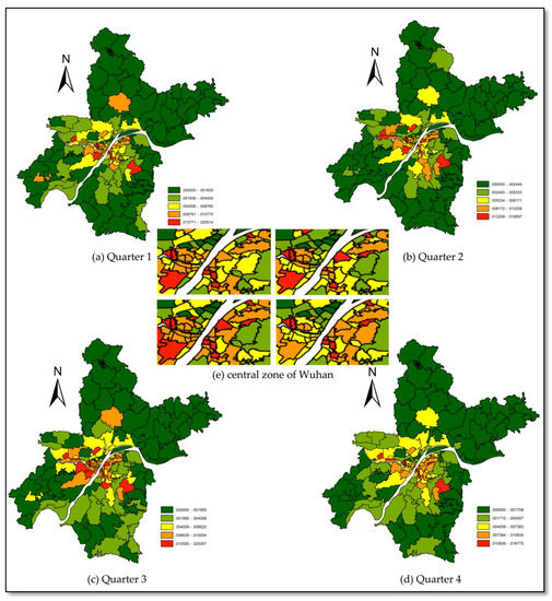 Figure 3 shows the distribution of theft rates using theft data as a whole for 2016 (Quarter 1 lasted from January to April), population data for 2013, and vector data of the districts in Wuhan.