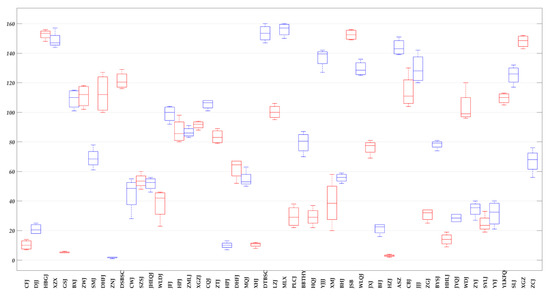 We ranked theft rates (Figure 3) from large to small by quarter as global rankings and used a boxplot (Figure 4) to show the changes in every community’s global ranking over the four time periods (Q1 to Q4, respectively). The boxplot, also known as a box-whisker plot, utilizes five statistics: minimum, first quartile, median, third quartile, and maximum. It can roughly show whether the data are symmetrical, as well as the distribution’s degree of dispersion, and other information, and is useful when comparing several samples.