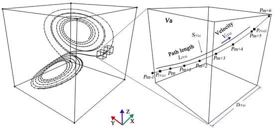 Our algorithm allocates the cube cells around the trajectory from the first point of a trajectory. Once the size of the cube cell is estimated, we can derive the length of the trajectory curve within each cube cell . It is first necessary to calculate the intersection coordinate of the trajectory and the cube cell . The calculation of intersection uses the function on each segment, since the cubic spline function is a piecewise function. We calculate the length of the trajectory curve , which yields the distance traveled by the object in the cube cell . The NormalizedLength is then calculated by using Formula (2).