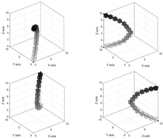 Figure 2 shows the TrajectoryTimeDensity (i.e., 3D cube cells as described above) of four simulated trajectories. The grayscale value of each cube cell represents the time density of the trajectory. The higher the grayscale value, the higher the corresponding density. The density of each trajectory is gradually increasing along the positive direction of the Z axis, from 0.1 to 1. The internal trajectory curves are visualized by setting the transparency of the cube cells surface.