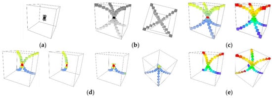 The TotalTimeDensity volume and the AverageTimeDensity volume are visualized using these two methods in Figure 4. In Figure 4a–c, the time density volumes are displayed by direct volume rendering using the grayscale color and rainbow color schemes. Figure 4a shows the intersection of cube cells of the four trajectories of Figure 3. The non-intersecting parts are set to be invisible here. Obviously, the intersection parts are symmetrical about the center point. In Figure 4d,e, the density volumes are sliced in different directions, some of which are generated using two slicing planes in two different directions. These different volume visualizations can help visually identify the space usage patterns.