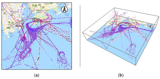 Figure 5 shows the flight trajectory points in two different ways. Figure 5a is a 2D map of 1 day of flight data (12 December 2017) for the two airports. This display ignores the elevation information of the sampling points, and the 3D spatial patterns cannot be identified. We place these trajectory points in a three-dimensional data cube (Figure 5b), where we can clearly see the 3D spatial position of the points. There is also a map of the study area attached to the x-y plane of the cube, as a geographical background of the movement trajectories. The location of the two airports is also marked on the map, where position A represents VHHH and position B represents VMMC. The geographical coverage of the flight trajectory is 177 km 186 km in the E-W and the N-S directions. Since the elevation difference of the flights’ movement range is too small compared to its length and width, the elevation difference is properly amplified to better observe the changes of the movement patterns in the vertical direction. However, this does not affect the overall view. Considering the spatial sampling resolution and the movement range of the flights, the appropriate cube cell size is estimated to be 800 m (see the principle in Section 3).