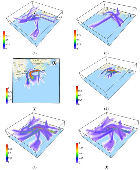Figure 6 shows the visualization of different TotalTimeDensity volumes. Figure 6a,b are the TotalTimeDensity volumes of arrival and departure flights, shown with direct volume rendering, respectively. The display in Figure 5b is cluttered with a high amount of overprinting, especially in the airspace near the airport. Both these displays are clearer than the traditional data cube (Figure 5), and the spatial-temporal patterns are more visually recognizable. The runways of VHHH are approximately in the east-west direction; therefore, the flights followed a trajectory from the south to the airport, then turned right at position a (Figure 6a), and finally entered the airport from the west and landed on the runway. However, the departing flights leave the airport from the east. The runways of VMMC are approximately in the north-south direction. All flights enter the airport from the south and take off from the north (position b in Figure 6b). These movement patterns and characteristics are clearly shown in Figure 6a,b.