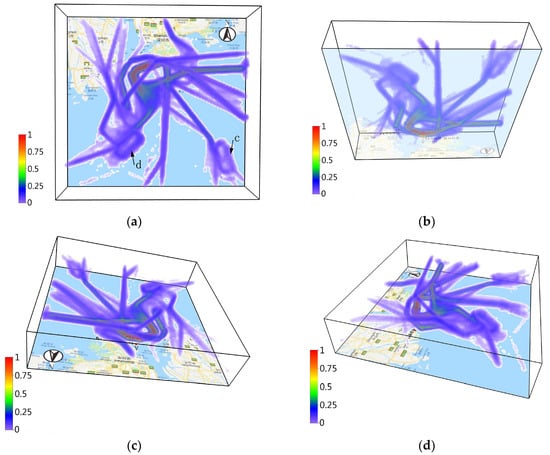 Figure 7 shows the TotalTimeDensity for all flights displayed from four different angles. All four panels show the same time density volume, where the top-left image sets the map transparency to 35% and looks up at the cube. In Figure 7, the time density by direct volume rendering is shown in red near the runway of the airport, on the approaching routes before landing, and on the departing routes just after takeoff, indicating that there are spatial regions with high time densities. As the distance from the airport increases, the TotalTimeDensity gradually decreases, and the corresponding volume rendering colors gradually change from orange to green to blue. These phenomena can be clarified by Figure 6e,f. According to Formula (5), TotalTimeDensity is regarded as the product of the AverageTimeDensity and the number of visits. In the airspace near the airport, the number of flights is large, but the flight speed is low; the corresponding TotalTimeDensity, therefore, is large. Similarly, in the airspace far from the airport, these two phenomena are exactly opposite, resulting in a low TotalTimeDensity value. There are two circles (c and d) in Figure 7a, where c is the trajectory of the planes that make an 8-shaped hovering maneuver, and d is the trajectory of the aircrafts that hover a circle. They are hovering arrival flights that are waiting for other planes to land or takeoff. These two movement features can also be confirmed in Figure 6a.
