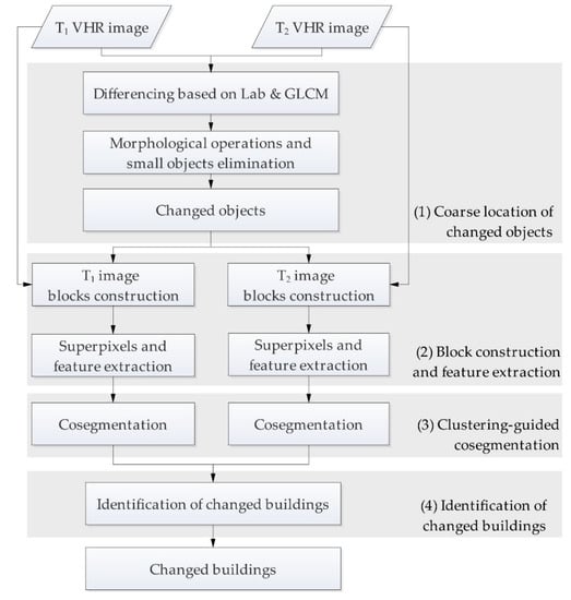In this study, by viewing the change from a macro-point, the changed pixels are initially extracted to determine the coarse locations of potentially changed buildings by using Lab and grey level co-occurrence matrix (GLCM) for the differencing method. Then, combined with the coarse locations, this study improves building change detection by using collaborative segmentation (co-segmentation) to gain an accurate identification of various changed buildings. Co-segmentation assumes that two or more images have the same or similar foreground objects, after which they are segmented [,,]. In this study, co-segmentation is used to capture urban building information across blocks according to their similar features. The improvements can contribute to building change detection in the following aspects: For buildings with large intra-class spectral differences, the differencing method proposed in this study can effectively capture the location of changed buildings. In addition, the multi-constraint for co-segmentation provided by the weak supervised approach and the fuzzy classification can exclude most non-building objects and accurately extract the shape and boundary information of the changed buildings.
