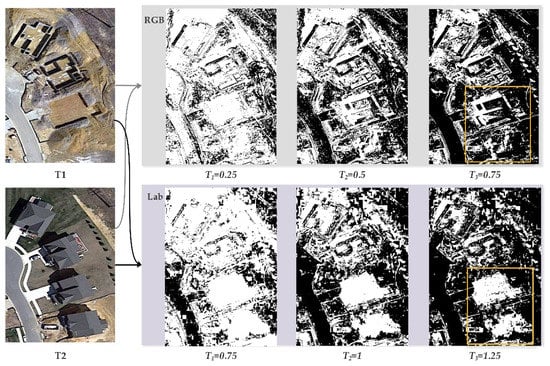 Figure 2 shows the contrast in RGB and Lab color spaces. When T is increased in the RGB color space, the building pixels and other pixels within the orange rectangle box disappear. However, in Lab color space, the pixels of building are preserved while those of other objects disappear. A possible reason may be that the color space of Lab is much wider than RGB, and Lab contains not only all the color gamut of RGB but also the colors perceived by human eyes []. Therefore, to enhance the ability for identifying different colors, this study calculates the differencing image by using the Lab color space.