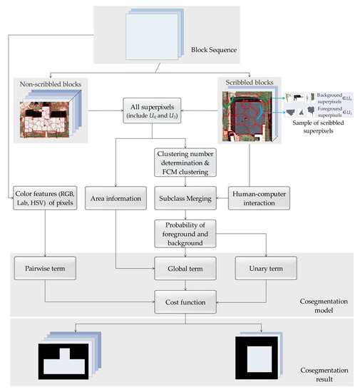 where are blocks and is the scribbled block; U is the set of scribbled foreground and background superpixels; Ri represents the superpixels segmented from the ith block; n is the amount of block R; is a higher-order term; is the number of superpixels in block Ii; is the matching coefficient of the energy function that takes into account its probability to belong to the foreground or the background (the details are supplied in []); and is the number of pixels in the high-order cluster that comprise three parts (foreground U1, background U0, and superpixel sets Ri). The high-level clusters are defined as follows: