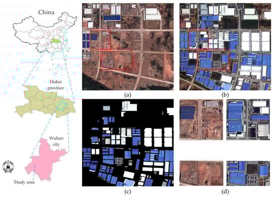 Study data: (a) image captured in 2013; (b) image captured in 2017; (c) ground truth of changed buildings; and (d) pertinent details of the two images.