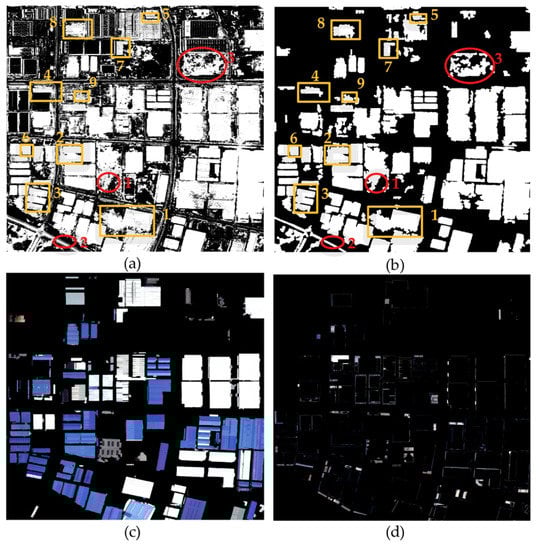 On the basis of the ground truth in Figure 5c, the comparative results generated by CPDOR and our method were further analyzed (Figure 10c,d, respectively). False detection and missing detection are also shown in the figures. In Figure 10, although some large buildings appear to have changed pixels after differencing, they are missed in the result of CPDOR. The difference may be attributed to the MBI values of the 2017 image that were extremely close to the ones of bare land in the 2013 image. In addition, relative to the final results of MBI for the differencing method, those of CPDOR showed some weaknesses in terms of distinguishing buildings from their adjacent changed objects (i.e., grass, shadow, etc.). Subsequently, their edges may appear greatly deviated from reality.