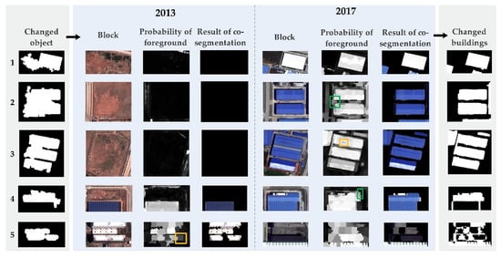 To further investigate the improved scheme on co-segmentation, the detection results of the first five objects in Figure 6b (orange rectangles) are shown again in Figure 7. In the two gray maps of foreground probability, a larger gray value denotes a relatively higher foreground probability of the pixel. Even if the building superpixels show different probability values, and even if there is a high probability that part of the road superpixels will have similar colors as that of the buildings, most of the building areas have higher foreground probabilities than their surrounding objects. Priori knowledge was generated for the co-segmentation model, and thus, different types of buildings can obtain higher foreground probability. For instance, although some differences are observed in the spectral and texture characteristics of the buildings in 2017, these buildings have higher foreground probabilities than their surroundings.