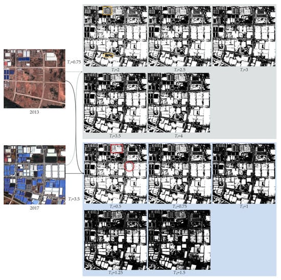 On the basis of images in the gray rectangle in Figure 8, the effect of different Tt values on the differencing results was investigated. The Ts value used in the experiment was 0.75. Under different Tt conditions, the extraction effects of the internal body of real changed buildings were essentially the same and only some feature edges or stripe-like features exhibited alterations. Examples of these stripes for some buildings are highlighted by the orange rectangle and circle in the first row of Figure 8. When Tt increased, the changed pixels on these edges gradually disappeared. When Tt exceeded a certain value, the obtained changed pixels became stable. In other words, regardless of the change in Tt, the main body of the building will be retained. This phenomenon may be attributed the texture feature used as the variance of GLCM. The change in the texture feature is relatively more responsive at the edge of the object, and the change within the object is generally zero (i.e., Xiao []). Therefore, if a pixel is located inside the object (i.e., any object type) before and after the change, the pixel will be unlikely affected by the change in Tt. Given that the method proposed in this study is used for the coarse positioning of changed pixels, there is no need for object edges to be highly accurate in the differencing phase. Therefore, the value of Tt can be set slightly larger for experiment.