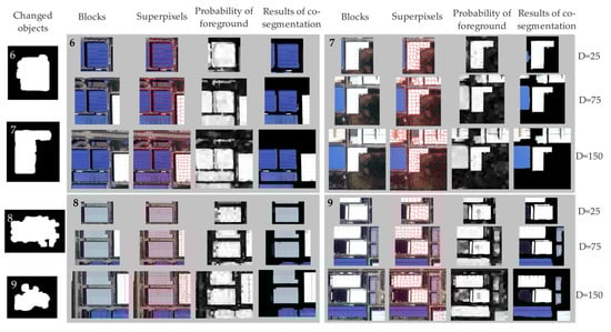 Take the changed buildings labeled sixth to ninth in Figure 6b as examples. The co-segmentation results of the blocks extracted from the image in 2017 with different sizes of D are shown in Figure 9. As shown by the second column of each gray rectangle in Figure 9, an increase in the size of D leads to a relatively higher number of superpixels. Too large blocks will cover many other surrounding objects, and this will not only influence the computation efficiency of the co-segmentation but also lead to the risk of false or missing detection. In Figure 9, several unchanged buildings can be observed around the changed objects (i.e., see 7 and 8), and false detections are likely to happen. Incidentally, the difference in D only affected a small part of the buildings, and most of the building pixels were segmented as the foreground.