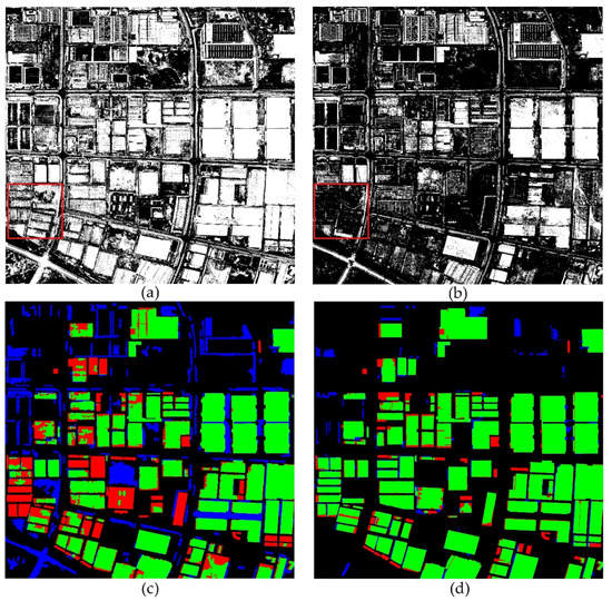 Comparison evaluation: (a,b) changes obtained by combining pixel-based detection and object-based recognition (CPDOR) when = 0.5 and = 1; (c) overlay between CPDOR result and ground truth, and (d) overlay between results of this study and ground truth. Green represents correct detection, red represents missing detection, and blue represents false detection.