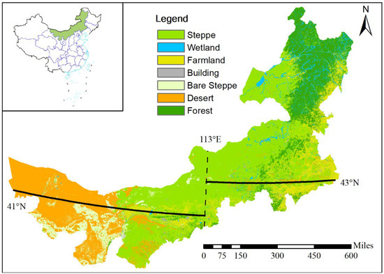 The Inner Mongolia Plateau (IMP) is chosen as the study area (Figure 1). IMP boasts the most important grassland resource in northern China [25]. IMP extends from 37.40° N to 53.38° N and from 97.2° E to 126.06° E, covering an area of 1.18 million square kilometers [3]. IMP has an annual precipitation 50–450 mm and an annual average temperature 1–10 °C. Both precipitation and temperature display a regional transition from semi-humid areas in east to semiarid and arid areas in west. Grassland degradation is a serious threat to sustainability of these ecosystems [26,27,28]. Northern China and, especially, Inner Mongolia Plateau have suffered severe ecological degradation in recent decades [29,30,31]. It is important for researchers, policy makers and resource managers to understand how each vegetation community responds to climate change. There are an increasing number of studies reported in current literature. Several examine status change of vegetation evolution [2,32]. Some investigate coupled impact of socioeconomic transformation and climate change on vegetation growth [9,13,33]. Few are about composition structure and its relationship with climate factors [15,34]. Most studies are focused on regional scale and interested in identifying regional patterns [2,35,36]. Little effort has been exerted to explore vegetation growth response to climate change among different plant communities over various precipitation zones [37,38].
