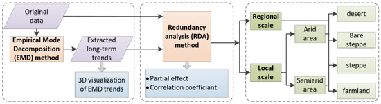 We synthesized the integrated research method depicted in Figure 2. First, we applied Empirical Model Decomposition (EMD) to extract long-term trends of EVI, precipitation, and temperature to investigate the spatial and temporal patterns of primary productivity and climate change. Secondly, we designed two east-to-west transects across the entire study area to examine spatial variations of vegetation response to climate change over different precipitation zones. Thirdly, we analyzed different responses of four types of plant communities over the two east-to-west transects, respectively. Finally, we applied redundancy analysis to explore partial and joint effects of precipitation and temperature on primary productivity and to determine whether the effects of precipitation or temperature, or both, on primary productivity varied regionally or over different types of vegetation.