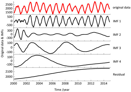 The algorithm of EMD was originally developed to decompose non-stationary and non-linear signals with several zero mean components [48], which was improved by adding new stopping criteria to make EMD implementation more effective [51]. Rilling’s EMD algorithm code was adapted in this paper. The following is a brief description of the EMD approach. Signal x(t) is the given time series of EVI, or precipitation or temperature (for details, see [51]):