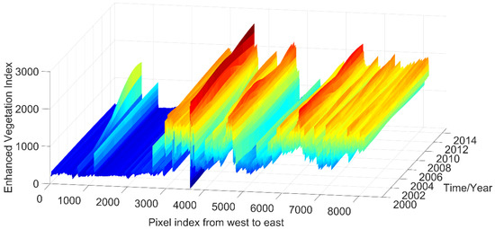 Long-term trends of change were extracted from the time series of original data through EMD. The outcomes of decomposition processes of EVI are illustrated in Figure 3, using the Steppe grassland as an example. The trends of change from 2000 to 2014 over 135 growth periods are plotted as surfaces along the east–west transection for EVI (Figure 4), precipitation (Figure 5) and temperature (Figure 6).