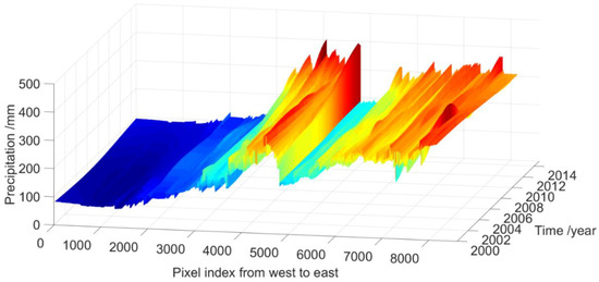 Precipitation trend surface was clearly rising from west to the middle position of the transect (Figure 5), indicating the transition from desert to grassland. In addition, the precipitation surface displayed many local fluctuations. For instance, there was a low and flat surface between 4300 and 5000 pixels (one pixel equals 250 m) and several abnormal peaks between 3500 and 4200 pixels from 2010 to 2014. Moreover, it appeared that precipitation showed a general increase in the eastern section in recent years.