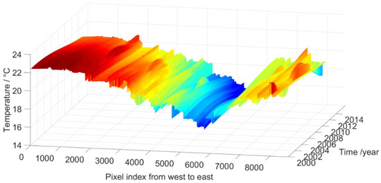 The temperature displayed a V-shaped spatial pattern. In the dry western part, temperature change showed a declining trend. It appeared that the drier the location was, the more apparent the declining trend was. However, this finding was different from the study of Chuai et al. [2], which reported an increase in temperature by linear regression of the original time series data. We attributed this difference to the extraction of longitudinal trend of change from the time-series temperature data, since a decreasing trend was also detected when we were running linear regression models. During the section of 4000–5500 pixels, there existed a valley (i.e., where the decreasing trend was apparent). The ground plant covers over this section were the steppe and farmland. The vegetation coverage was very high (Figure 4) in comparison with other sections. It was clear that the trend of temperature change in this section was significantly modified by local vegetation growth condition. The trend of temperature change near the farthest eastern section displayed noticed local variations.