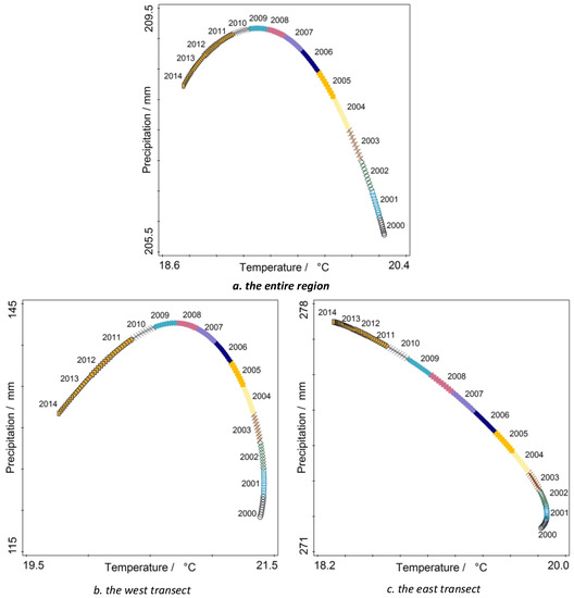 However, after we bisected the transect into the arid and semiarid sections, the results revealed different findings. In the semiarid section, precipitation, temperature and their joint effect all made noticeable contribution to explain the variation proportions of EVI, although the joint effect and precipitation had higher explanation power than temperature did (Table 6). However, the partial effect of precipitation on primary productivity was lower than temperature in the west transect. The joint effect of precipitation and temperature was higher in both regional and transect models, but was much higher (84.6%) in the west transect model. These findings contradict the common understanding that precipitation is the most important factor driving grassland primary productivity. Therefore, there is a need to reiterate that this paper was using the extracted (or filtered) trend data to examine the linear relationship among primary productivity, precipitation and temperature. In other words, all variables considered in the models were the trends of change, which were the inputs for examining the relationship between primary productivity, precipitation and temperature. As revealed in Table 7, the coefficients of Pearson’s Correlation between the trends of EVI and precipitation were in general positive, which indicated that precipitation directly and positively affected EVI. However, the relationship between temperature and EVI was much more complicated. We further examined the unconventional relationship of the trends of change among EVI, precipitation and temperature by plotting the relationship between the EMD filtered residues of precipitation and temperature over 135 periods, as shown in Figure 7. It was clear that temperature was declining during the study period and precipitation was rising in the early period, but declining in the later period (Figure 7a). There existed apparent regional differences. In the west section, from 2000 to 2009, precipitation increased significantly, but temperature slightly declined (Figure 7b). However, after 2009, both precipitation and temperature noticeably decreased. From the perspective of affecting the trend of change of EVI (the bottom residue curve of Figure 3), the filtered trend of temperature was more closely and negatively correlating with the trend of EVI. Furthermore, the correlation plot of precipitation and temperature in the east section showed a smooth curve, but reversing the trend of EVI (Figure 7c). As a result, both trends of precipitation and temperature almost equally affected the trend of EVI, but the trend of precipitation was positively responding, while the trend of temperature was negatively influencing. We were analyzing the relationships among the trends of changes of the variables of interest, not the original observations. Moreover, the signs of the partial or joint effects are important for knowing how each factor affects primary productivity.