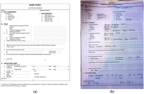 Names form used by the national naming authority (NNA) in Indonesia: (a) an example of the “Name Form” for collecting toponyms in the field; (b) complete name form from fieldwork in Yogyakarta. (Courtesy of Badan Informasi Geospasial).