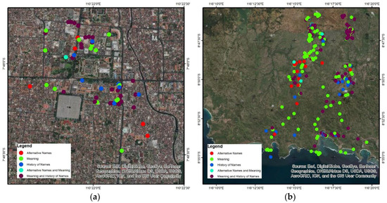 The participants in the toponymic survey project in Yogyakarta were only able to collect 63 place names with information on their history, meaning, and alternative names from a total of 743 features (Figure 4a). It was difficult to interview or select a person who fully understood the meaning and history of each place. Support and coordination from the local government of the Special Region of Yogyakarta could probably help increase data completeness. Unfortunately, the local government was unable to support the survey adequately due to time constraints. However, in the preliminary survey, communication and coordination with the local government were done as part of the procedure.