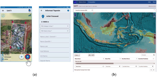 Selected screenshots of SAKTI (Sistem Akusisi Data Toponim Indonesia/Indonesian Toponymic Data Acquisition System): (a) “Name Form” for collecting toponyms in the field in SAKTI mobile application; (b) SAKTI Web-GIS (http://sakti.big.go.id/sakti/webgis/).
