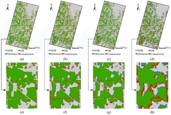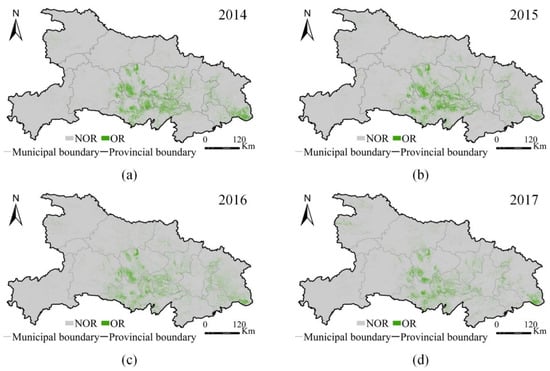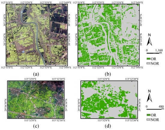 - Applying the CSRA method on remote sensing images to produce OR planting maps automatically. The OR maps includes: six GF-1 WFV-derived OR planting maps of Wuxue City, abbreviated as Result 1; GF-1 WFV-derived OR planting maps of Hubei Province from 2014 to 2017, abbreviated as Result 2; one GF-1 WFV-derived, one GF-2 PMS MSS-derived, and two RapidEye-derived OR planting maps of the overlap region of these four images, abbreviated as Result 3.