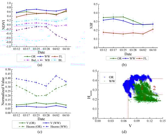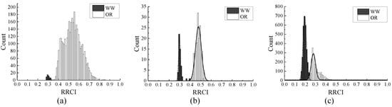- OR and WW. Figure 8 shows the performance of RRCI for distinguishing OR and WW, which has good separability in each part of the -V space. The thresholds for parts 1–3 are 0.36, 0.43, and 0.25, respectively. In addition, the remaining forest land samples in step (2) can be divided into two groups: the first group with V values smaller than 0.07 and the second group located in part 3 of the -V space. The RRCI values of the second group are all smaller than 0.2. Thus, the FL samples with NIR values larger than 0.23 have no confusion with OR. Therefore, the third step of the CSRA method is separating OR from WW using the rules: RRCI ≥ 0.36 when V ≥ 0.07 and ≤ 0.25; RRCI ≥ 0.43 when V ≥ 0.12 and 0.25 < ≤ 0.42; and RRCI ≥ 0.25 when 0.07 ≤ V < 0.12 and 0.25 < ≤ 0.42.