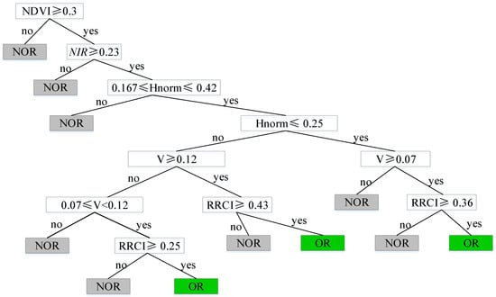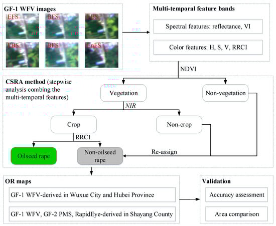- Developing the CSRA method based on GF-1 WFV-derived samples of Wuxue City. Section 2.3.2 has introduced the general idea of CSRA, which is a stepwise exclusive approach to achieve the goal of extracting OR. NDVI, NIR, and RRCI are successively used to separate vegetation from non-vegetation types, crop from non-crop types, and OR from WW. The threshold value in each step is obtained by the histogram thresholding method, which is the refined overlap point beyond two groups [3]. Finally, the CSRA approach is performed to define the classification rules of the decision tree as its effectiveness and efficiency having been proved in the field of remote sensing classification [5,46]. The CSRA method is executed using IDL. The acquisition of threshold values and detailed DT of the CSRA method will be reported in Section 3.1.