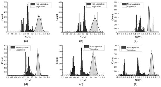 - Vegetation and non-vegetation types. Figure 6a–f shows the histogram results of NDVI between vegetation and non-vegetation types corresponding to 03/12, 03/17, 03/25, 03/28, 04/02, and 04/10, respectively. The threshold of NDVI for classifying vegetation from non-vegetation types is 0.3 at each flowering stage. Thus, the first step of the CSRA method is classifying vegetation pixels from non-vegetation pixels using the rule: NDVI ≥ 0.3.