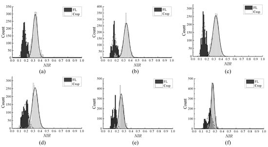 - Crop and non-crop types. Figure 7, regarding the histogram groups of NIR for crop and forest land, reveals that NIR is useful to distinguish them with a threshold of 0.23. Figure 7f shows some overlap with part of the FL samples having NIR values larger than 0.23, which is caused by the beginning of tree’s nutritional growth stage since early April every year in Yangtze River Basin, China. These samples were gathered and analyzed in the next step. Thus, the second step of the CSRA method is separating the crop pixels from FL using the rule: NIR ≥ 0.23.