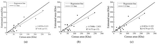 3.3.2. Comparison of the Estimated Oilseed Rape Planting Areas with Agricultural Census Data
