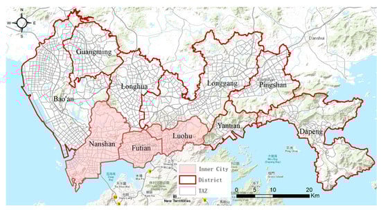 The administrative districts and traffic analysis zones (TAZs) of Shenzhen city.