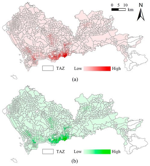 Figure 2 shows the spatial distribution of ASR and DSR on weekdays in Period 1 on TAZ-level, which indicates that the inner city has a higher value of service rate than the outer city at the aggregate level. In this paper, only the spatial distribution of service rate on weekdays in Period 1 are presented, since there was no significant difference in the spatial distribution of the service rate between the six periods or between weekdays and weekends.
