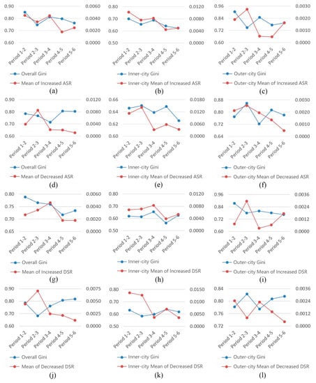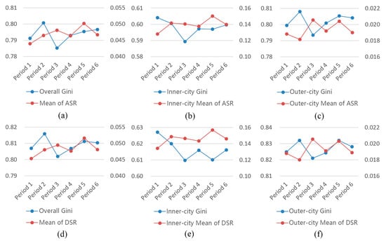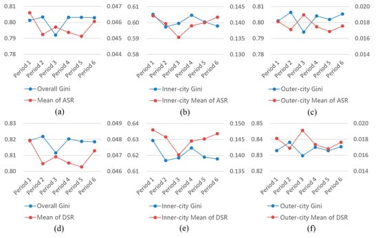 Figure 5 shows that the Gini coefficients of inner city TAZs were always smaller than the Gini coefficients of outer city TAZs, which indicates that the inner city is more equitable than the outer city in service rate change. Taking the increased ASR in Period 2–3 as an example, when the two companies increased the subsidy, the overall Gini coefficient for the increased ASR declined while the mean of the increased ASR was at the medium level, when compared with other periods. The Gini coefficient of the increased ASR in inner city TAZs present a similar, but declining trend and the mean increased ASR for inner city TAZs was also at the medium level. In addition, the Gini coefficient of the increased ASR of the outer city TAZs declined to its lowest level compared with other periods, while the mean of the increased ASR for outer-city TAZs was at the highest level. This indicates that in Period 2–3 the outer city TAZs had the highest increased ASR and service rate reached the most equitable situation. Furthermore, the overall, the inner city, and the outer-city Gini coefficients for increased ASR values declined when the two companies reduced the subsidy to passengers in Period 3–4. Moreover, the mean increased ASR for inner city TAZs rose slightly while the mean increased ASR for outer-city TAZs dropped dramatically. In Period 4–5, the overall, the inner city, and both the outer-city Gini coefficients and their mean values of increased ASR also decreased. In period 5–6, the overall and the inner-city TAZ Gini coefficients both declined while the Gini coefficient of outer city TAZs increased a little. In addition, mean values of increased ASR for the overall, the inner-city, and the outer-city TAZs rose in Period 5–6.