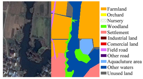 Figure 2. An example of a result from the local field surveys. The left picture is a remote sensing image displaying a base map in a field survey. The right picture is a digitalized map showing local land use. The small woodland patches along the river and around settlements could be accurately identified, and areas of aquaculture could be distinguished from other waters through local field surveys.