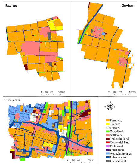Eastern China has been experiencing rapid urbanization in the recent several decades. This region is also a leader in innovation in Chinese urbanization development, and its development experience therefore provides critical examples for other regions. Considering that eastern China covers a large area, study areas in different regions helped to identify various landscape change characteristics at a local scale and have provided evidence for efficient management policy making. Villages located in rural areas of three provinces were selected (Figure 1): (1) The villages of Yanggezhuang, Gaozhuang and Shaziying are located in Daxing (DX), Beijing. Because of the effects of metropolitan development, these areas have greater financial and technical investments that provide more job opportunities and stronger economic development in the local community. That draws local farmers migrating from nearby provinces, causing high land use pressure; (2) The villages of Wangzhuang and Xingyuan in Quzhou (QZ), Hebei Province, are traditional agricultural production areas in the North China Plain. Production of food and economic crops still plays a dominant role in the local economy. Fields are mainly managed by local households. The local community shows a gradual and slow development of both the society and economy; (3) The villages of Zhujiaqiao, Yangzhong and Donggangjing are in Changshu (CS), Jiangsu Province, where the weather conditions differ from those in the other two areas, including more rain, and there is strong private economic development and a high level of urbanization in this part of eastern China. In these areas, family workshops are much more developed, and agricultural land is intensively cultivated by agricultural businesses and professional farmers who rent the lands from local farmers.