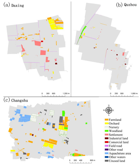 Figure 4. Maps of plots with changed land use these maps present the shape, distribution, and increased land use of changed patches from 2009 to 2012. Each patch showed land use in 2012. (a) The changed land use patches map of Daxing; (b) the changed land use patches map of Quzhou; (c) the changed land use patches map of Changshu