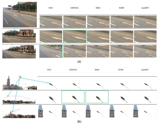Figure 10 shows some examples of different descriptors applied on the Kashiwa data. In Figure 10a, a point in a far street lamp made all of the methods failed except the dual-space intensity. The results represent a challenging case as the wrongly predicted positions vary largely. It was also a rare case that all of the feature-based descriptors failed to find the correct match. This might be interpreted as meaning that the complicated SIFT or SURF descriptor could simulate more complex distortions and therefore created ambiguity (false positive). Figure 10b shows the large search range and the changes of scale made the intersity, HOG and CENSUS descriptors failed in matching a point on a cover. In Figure 10c the changes of view sight at a corner resulted one matching error of the SURF and HOG descriptors.