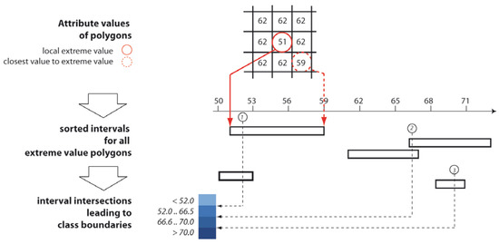 Schematic workflow for preserving local extreme value polygons: Determination of intervals and setting of class boundaries.