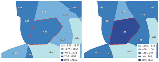 Another objective could be to preserve or enhance “large” attribute value differences of adjacent polygons in choropleth maps. A detailed description of the method outlined below is given in [36]. The algorithm starts with a determination of the value differences of all neighboring polygons. Thereafter, a reduction to the “significant” (i.e., the largest differences) takes place. The necessary threshold can be derived, for example, from a percentile of the frequency distribution. Then, various data classifications are calculated taking into account predefined conditions such as minimum and maximum number of classes. For each classification, a new index, the Edge Preserving Index (EPI), is calculated, which compares the original attribute value difference with the respective class value difference. Based on this index, it is now possible to identify best preservation (EPI against 0) or the best emphasis (EPI against +1). Not only numerically via the EPI [36], but also visually, it can be shown that the new approach improves the desired effect of preserving or emphasizing value differences (Figure 6).