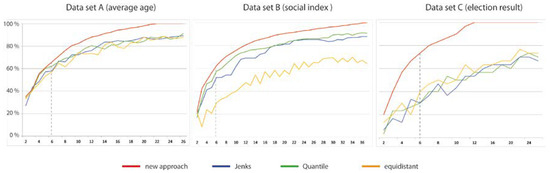 In order to not only visually demonstrate the added value of the approach (Figure 4), empirical tests were conducted to investigate the degree of conservation of local extreme value polygons depending on the number of classes and the characteristics of the data set. Table 7 describes three selected datasets and Figure 5 shows the respective numerical results.