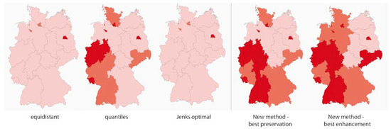 Another very relevant problem, which will be elaborated in more detail below, is related to the use of classified choropleth maps, which are necessary for the depiction of relative values (Table 4e and Table 6a). In contrast to the unclassified version, the transformation of original values into discrete intervals offers the advantage of a better and faster overview due to the reduced number of classes together with sharper color or grey value contrasts. However, conventional classification methods such as equidistant, quantile or natural breaks, together with the number of classes, the consideration of boundary classes or the possible neglect of outliers, are known to have a significant impact on the class memberships—and thus on the visual perception and interpretation of choropleth maps.