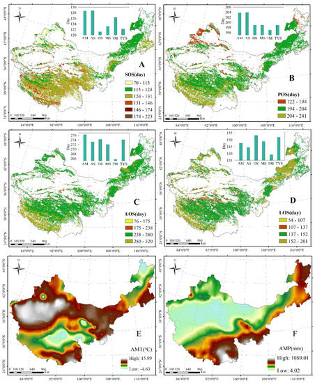 3.1.1. Spatial Distribution of Plant Phenology, AMT, and AMP in China’s Grasslands